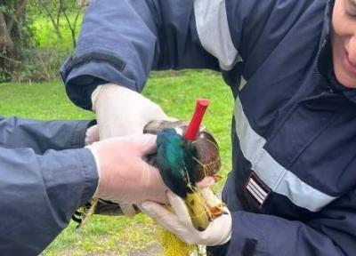 اردکی که درحال شنا با چاقویی که در گردنش فرو رفته بود دیده شد پس از یک هفته کوشش به وسیله امدادگران گرفته شد و چاقو از گردنش خارج گشت.