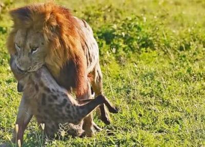 ببینید ، اتفاقی عجیب و نادر در حیات وحش؛ شیر نر یک کفتار را خورد!